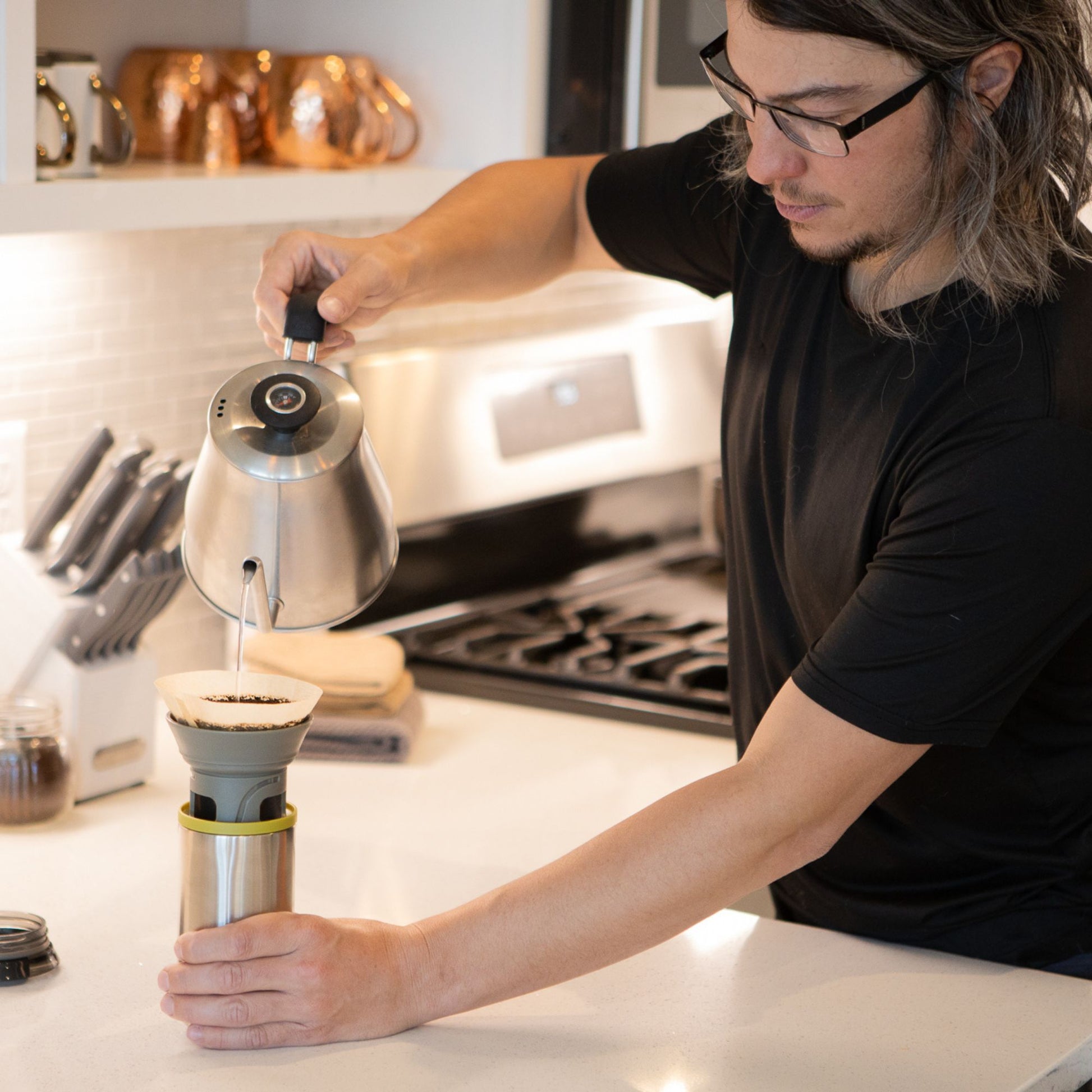 El corazón del Cuppamoka es su cono de goteo retráctil. Con un simple giro, el porta-filtro emerge de la taza para que puedas colocar el papel y verter el agua. Una vez terminada la extracción, se guarda nuevamente dentro de la taza, ahorrando espacio y manteniendo todo limpio.